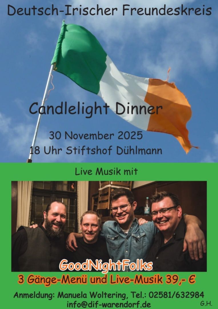 Den musikalischen Rahmen gestaltet die Gruppe GoodNightFolks aus Greven, der wir seit über 15 Jahren sehr verbunden sind und die ein Garant für einen unvergesslichen Abend irischer Live-Musik ist.