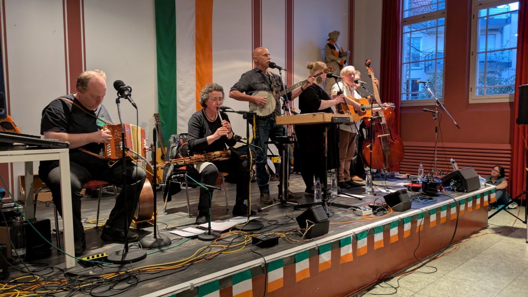 Die sechs Musiker und Musikerinnen drehten sich nicht "im Kreis", sondern wussten mit ihren zahlreichen Instrumenten zu begeistern. Aus ihrem riesigen Repertoire von Songs hatten sie von ruhigen über instrumentale Stücke für jeden Geschmack etwas im Gepäck. Immer wieder präsentierten sie auch stimmgewaltige A-capella Stücke, wie "The parting glass". Wer textsicher war, konnte auch mitsingen.